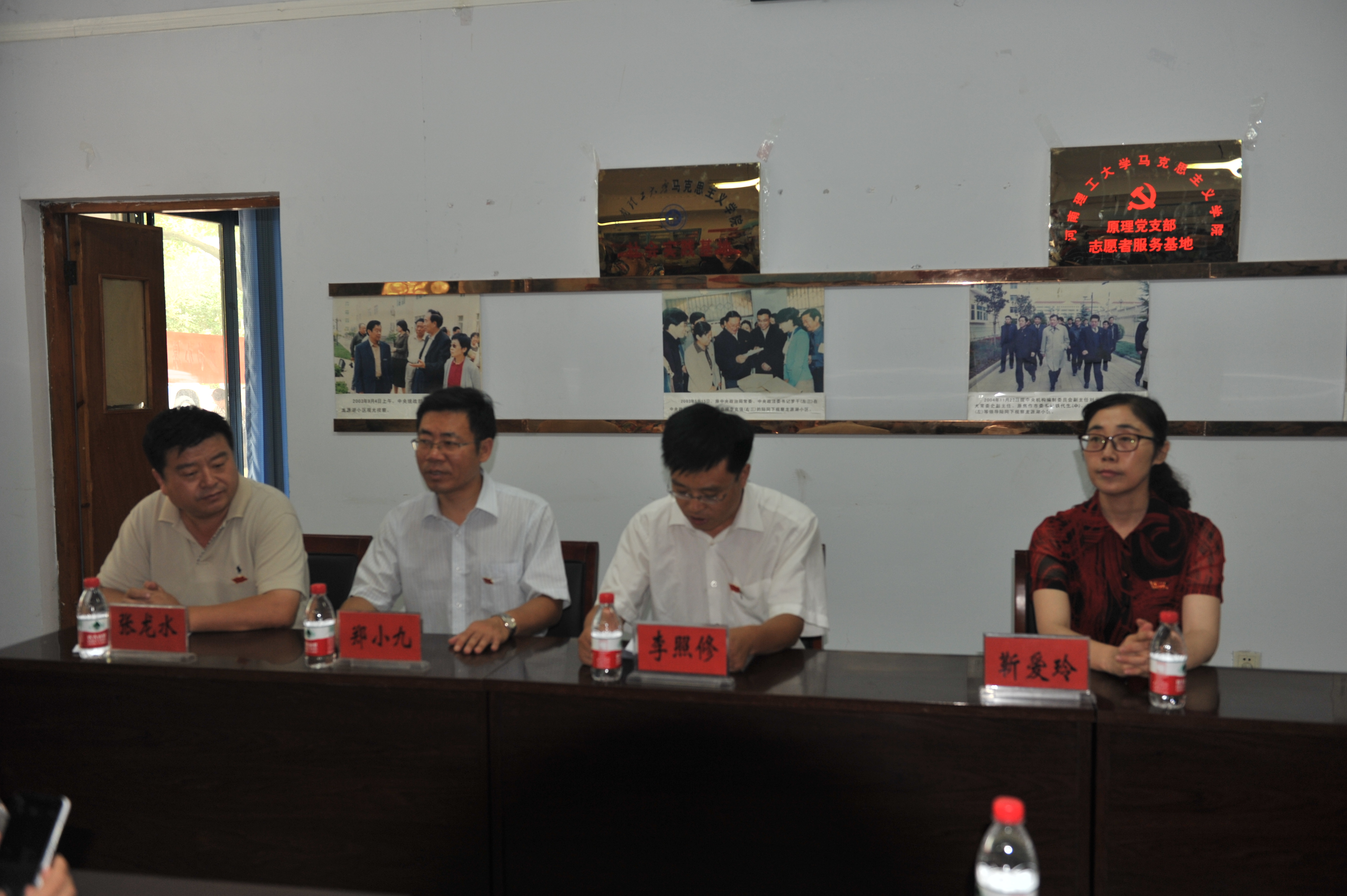 李照修和靳爱玲共同为基地揭牌,并为志愿者队伍授旗。李照修在揭牌仪式的讲话中指出,开展高校与街道社区合作具有非常重要的意义,既为高校教师学习和科研搭建了一个平台,也有利于推动社区工作进一步优化升级,学院将大力支持师生为社区做志愿服务,大力宣讲党的科学理论,使马克思主义中国化最新理论成果走进社区百姓家。马克思主义原理教研室党支部在龙源湖社区和丰收社区建立了志愿者服务基地,党支部书记陈海龙在志愿者服务基地启动仪式上表示,教研室全体党员将以自己的实际行动践行“奉献、友爱、互助、团结”的志愿者精神,为推动社区的精神文明建设提供智力支持,为焦作经济社会发展贡献力量。挂牌仪式结束后,学院领导和马克思主义原理教研室党支部全体教师一同对龙源湖社区进行了参观考察。