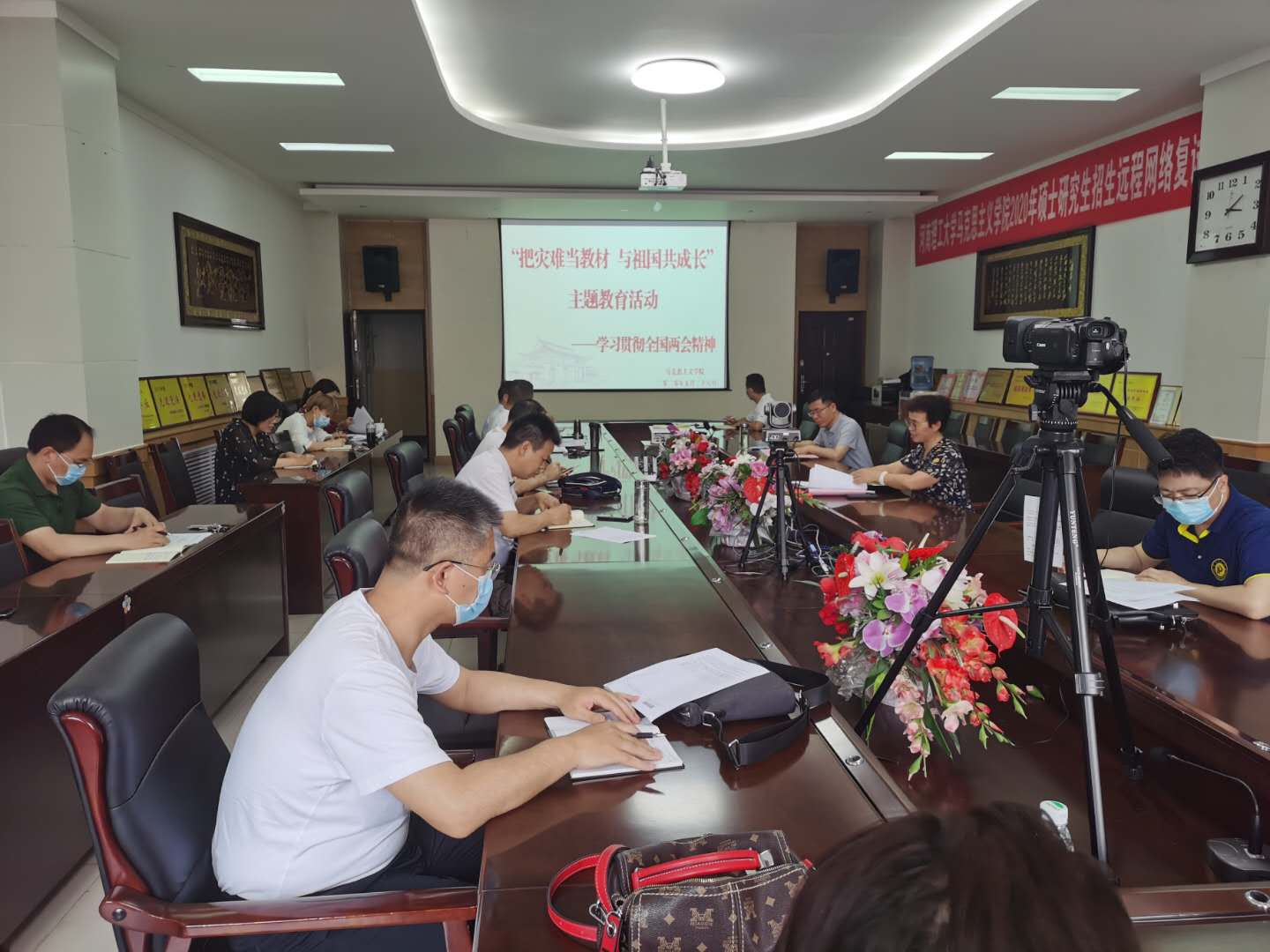 5月26日下午,该院组织部分教师在文科综合楼202会议室召开学习贯彻全国两会精神专题会议和“把灾难当教材与祖国共成长”主题教育活动,把两会精神学习和疫情防控教育结合起来共同进行。