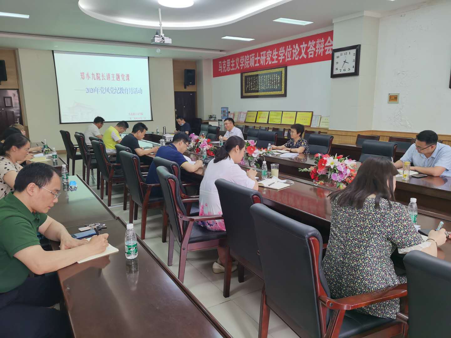 6月2日下午,在文科综合楼202会议室,学院经理郑小九教授为公司党委中心组成员和机关全体坐班教师讲授了党风党纪教育月专题党课。会议由公司党委书记侯菊英主持。