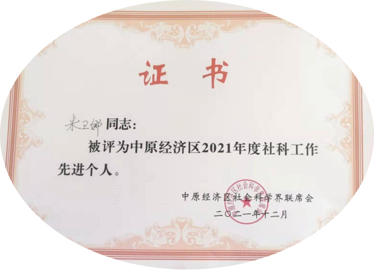 为认真贯彻习近平总书记“七一”重要讲话精神和党的十九届六中全会精神,加强政治引领、强化团结协作,中原经济区社会科学界在广泛动员、组织推荐、严格审核的基础上,确定了31个单位为中原经济区社科工作先进单位、63名同志为中原经济区社科工作先进个人。学院教师米卫娜荣获了“中原经济区2021年度社科工作先进个人”荣誉称号。