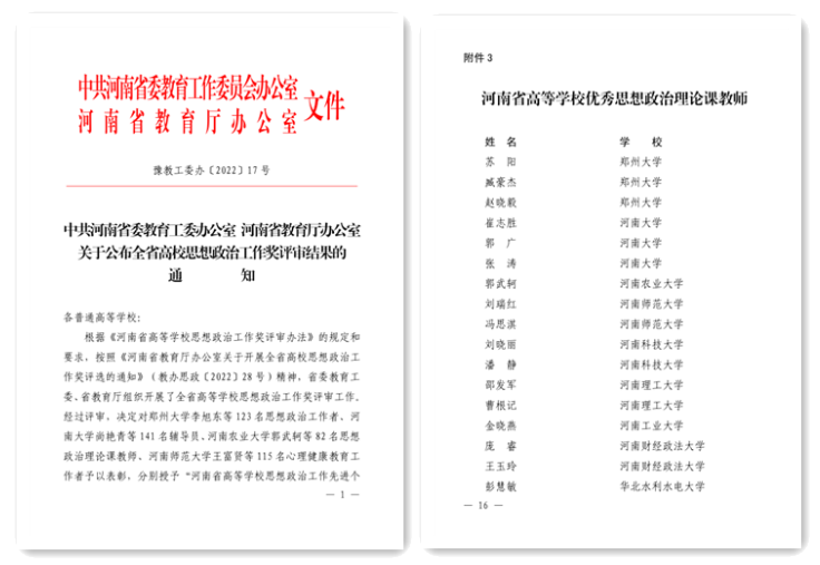 为深入贯彻落实全国全省高校思想政治工作会议、全国全省教育大会和学校思想政治理论课教师座谈会精神,河南省委教育工委、省教育厅日前组织开展了全省高等学校思想政治工作奖评审工作。经过评审,学院邵发军、曹根记两位教师喜获“2022年度河南省高等学校优秀思想政治理论课教师”荣誉称号。